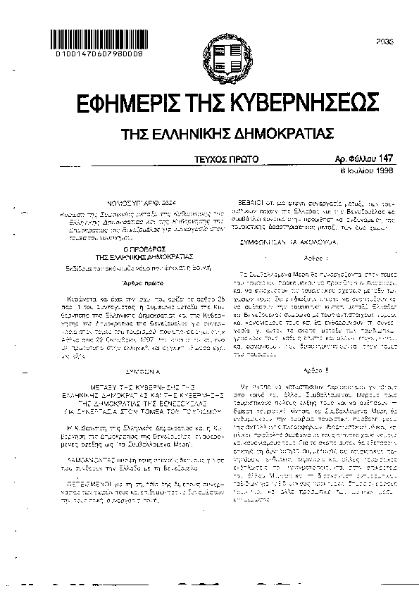 ΚΥΡΩΣΗ ΤΗΣ ΣΥΜΦΩΝΙΑΣ ΜΕΤΑΞΥ ΤΗΣ ΚΥΒΕΡΝΗΣΗΣ ΤΗΣ ΕΛΛΗΝΙΚΗΣ ΔΗΜΟΚΡΑΤΙΑΣ & ΤΗΣ ΚΥΒΕΡΝΗΣΗΣ ΤΗΣ ΔΗΜΟΚΡΑΤΙΑΣ ΤΗΣ ΒΕΝΕΖΟΥΕΛΑΣ ΓΙΑ ΣΥΝΕΡΓΑΣΙΑ ΣΤΟΝ ΤΟΜΕΑ ΤΟΥ ΤΟΥΡΙΣΜΟΥ
