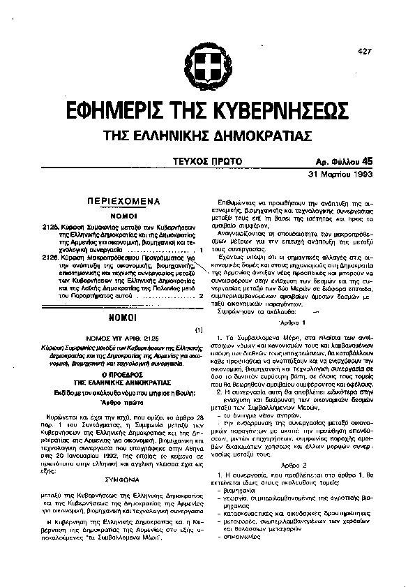 • ΚΥΡΩΣΗ ΣΥΜΦΩΝΙΑΣ ΜΕΤΑΞΥ ΤΩΝ ΤΩΝ ΚΥΒΕΡΝΗΣΕΩΝ ΤΗΣ ΕΛΛΗΝΙΚΗΣ ΔΗΜΟΚΡΑΤΙΑΣ ΚΑΙ ΤΗΣ ΔΗΜΟΚΡΑΤΙΑΣ ΤΗΣ ΑΡΜΕΝΙΑΣ ΓΙΑ ΟΙΚΟΝΟΜΙΚΗ, ΒΙΟΜΗΧΑΝΙΚΗ ΚΑΙ ΤΕΧΝΟΛΟΓΙΚΗ ΣΥΝΕΡΓΑΣΙΑ