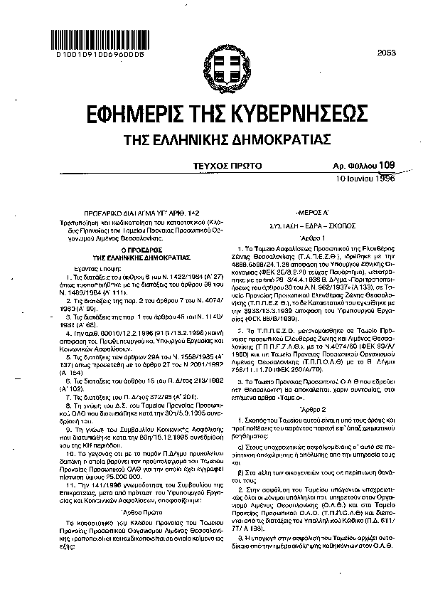 • ΤΡΟΠ/ΣΗ ΚΑΙ ΚΩΔΙΚΟΠΟΙΗΣΗ ΤΟΥ ΚΑΤΑΣΤΑΤΙΚΟΥ (ΚΛΑΔΟΣ ΠΡΟΝΟΙΑΣ) ΤΟΥ ΤΑΜΕΙΟΥ ΠΡΟΣΩΠΙΚΟΥ ΟΡΓΑΝΙΣΜΟΥ ΛΙΜΕΝΟΣ ΘΕΣ/ΝΙΚΗΣ