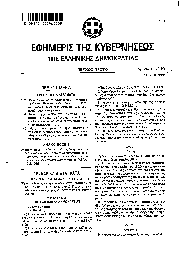 • ΙΔΡΥΣΗ ΚΛΙΝΙΚΗΣ ΚΑΙ ΕΡΓΑΣΤΗΡΙΟΥ ΣΤΗΝ ΙΑΤΡΙΚΗ ΣΧΟΛΗ ΤΟΥ ΕΘΝΙΚΟΥ ΚΑΙ ΚΑΠΟΔΙΣΤΡΙΑΚΟΥ ΠΑΝΕΠΙΣΤΗΜΙΟΥ ΑΘΗΝΩΝ ΚΑΙ ΚΑΘΟΡΙΣΜΟΣ ΤΟΥ ΕΣΩΤΕΡΙΚΟΥ ΤΟΥΣ ΚΑΝΟΝΙΣΜΟΥ