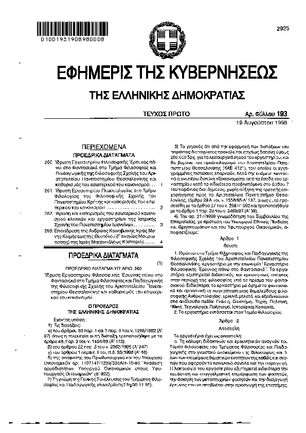 ΙΔΡΥΣΗ ΕΡΓΑΣΤΗΡΙΟΥ ΦΙΛΟΣΟΦΙΚΗΣ ΕΡΕΥΝΑΣ ΠΑΝΩ ΣΤΟ ΦΑΝΤΑΣΙΑΚΟ ΣΤΟ ΤΜΗΜΑ ΦΙΛΟΣΟΦΙΑΣ & ΠΑΙΔΑΓΩΓΙΚΗΣ ΤΗΣ ΦΙΛΟΣΟΦΙΚΗΣ ΣΧΟΛΗΣ ΤΟΥ ΑΡΙΣΤΟΤΕΛΕΙΟΥ ΠΑΝ/ΜΙΟΥ ΘΕΣ/ΝΙΚΗΣ & ΚΑΘΟΡΙΣΜΟΣ ΤΟΥ ΕΣΩΤΕΡΙΚΟΥ ΚΑΝΟΝΙΣΜΟΥ