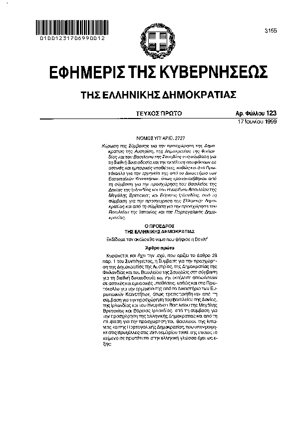 • ΚΥΡΩΣΗ ΣΥΜΒΑΣΗΣ ΓΙΑ ΤΗΝ ΠΡΟΣΧΩΡΗΣΗ ΤΗΣ ΔΗΜΟΚΡΑΤΙΑΣ ΤΗΣ ΑΥΣΤΡΙΑΣ ΤΗΣ ΔΗΜΟΚΡΑΤΙΑΣ ΤΗΣ ΦΙΛΑΝΔΙΑΣ ΚΑΙ ΤΟΥ ΒΑΣΙΛΕΙΟΥ ΤΗΣ ΣΟΥΗΔΙΑΣ ΣΤΗ ΣΥΜΒΑΣΗ ΓΙΑ ΤΗ ΔΙΕΘΝΗ ΔΙΚΑΙΟΔΟΣΙΑ ΚΑΙ ΤΗΝ ΕΚΤΕΛΕΣΗ ΑΠΟΦΑΣΕΩΝ ΣΕ ΑΣΤΙΚΕΣ ΚΑΙ ΕΜΠΟΡΙΚΕΣ ΥΠΟΘΕΣΕΙΣ ΚΑΘΩΣ ΚΑΙ ΣΤΟ ΠΡΩΤΟΚΟΛΛΟ