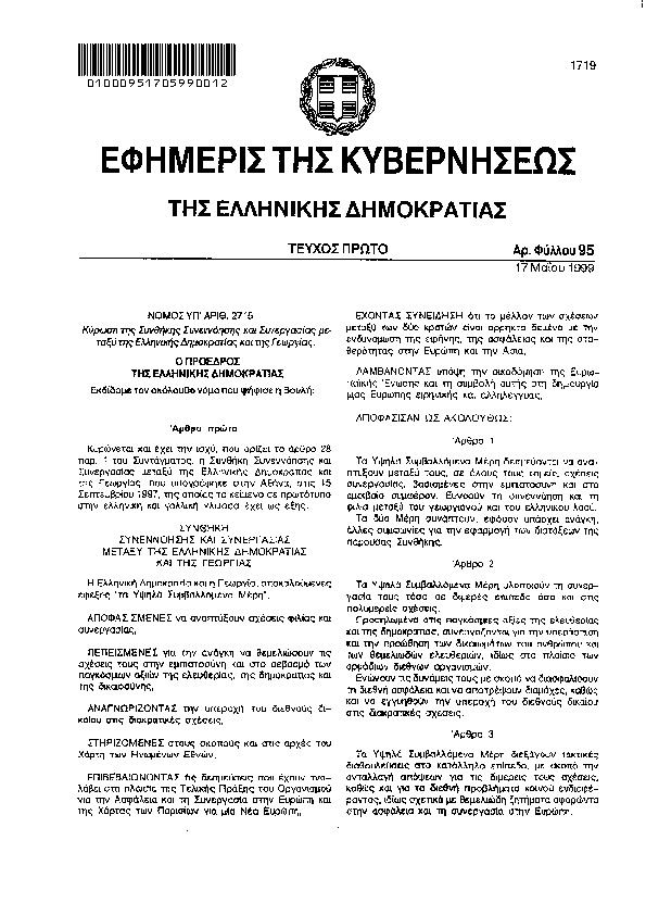 • ΚΥΡΩΣΗ ΤΗΣ ΣΥΝΘΗΚΗΣ ΣΥΝΕΝΝΟΗΣΗΣ ΚΑΙ ΣΥΝΕΡΓΑΣΙΑΣ ΜΕΤΑΞΗ ΤΗΣ ΕΛΛΗΝΙΚΗΣ ΔΗΜΟΚΡΑΤΙΑΣ ΚΑΙ ΤΗΣ ΓΕΩΡΓΙΑΣ