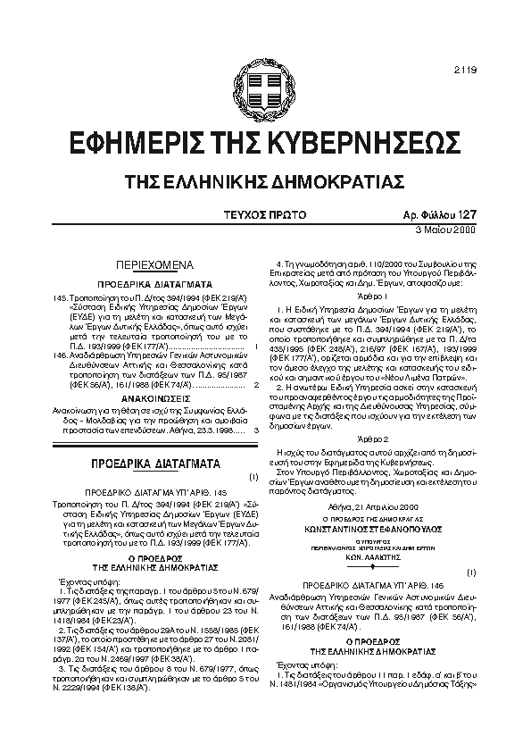 • ΤΡΟΠΟΠΟΙΗΣΗ ΤΟΥ ΠΔ 394/1994 (ΦΕΚ Α 219) ΣΥΣΤΑΣΗ ΕΙΔΙΚΗΣ ΥΠΗΡΕΣΙΑΣ ΔΗΜΟΣΙΩΝ ΕΡΓΩΝ ΕΥΔΕ ΓΙΑ ΤΗ ΜΕΛΕΤΗ ΚΑΙ ΚΑΤΑΣΚΕΥΗ ΤΩΝ ΜΕΓΑΛΩΝ ΕΡΓΩΝ ΔΥΤΙΚΗΣ ΕΛΛΑΔΑΣ ΟΠΩΣ ΑΥΤΟ ΙΣΧΥΕΙ ΜΕΤΑ ΤΗΝ ΤΕΛΕΥΤΑΙΑ ΤΡΟΠ/ΣΗ ΤΟΥ ΜΕ ΤΟ ΠΔ 193/1999 ΦΕΚ Α 177