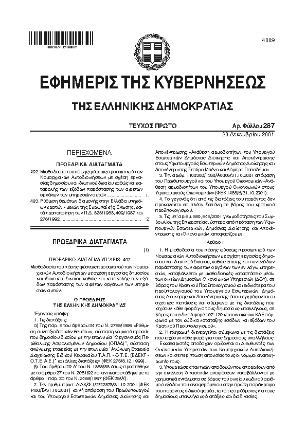 9. ΦΕΚ 286/A, 2001 http://www.et.gr/ Προεδρικό Διάταγμα
