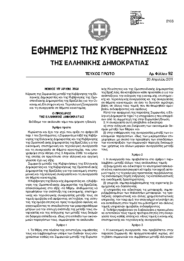 ΚΥΡΩΣΗ ΤΗΣ ΣΥΜΦΩΝΙΑΣ ΜΕΤΑΞΥ ΤΗΣ ΚΥΒΕΡΝΗΣΗΣ ΤΗΣ ΕΛΛΗΝΙΚΗΣ ΔΗΜΟΚΡΑΤΙΑΣ ΚΑΙ ΤΗΣ ΚΥΒΕΡΝΗΣΗΣ ΤΗΣ ΟΜΟΣΠΟΝΔΙΑΚΗΣ ΔΗΜΟΚΡΑΤΙΑΣ ΤΗΣ ΒΡΑΖΙΛΙΑΣ ΓΙΑ ΤΗΝ ΟΙΚΟΝΟΜΙΚΗ, ΕΠΙΣΤΗΜΟΝΙΚΗ ΚΑΙ ΤΕΧΝΟΛΟΓΙΚΗ ΣΥΝΕΡΓΑΣΙΑ ΚΑΙ ΤΗ ΣΥΝΕΡΓΑΣΙΑ ΣΕ ΘΕΜΑΤΑ ΚΑΙΝΟΤΟΜΙΑΣ.