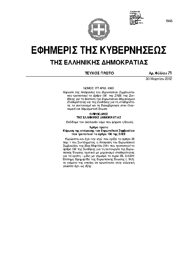 ΚΥΡΩΣΗ ΤΗΣ ΑΠΟΦΑΣΗΣ ΤΟΥ ΕΥΡΩΠΑΙΚΟΥ ΣΥΜΒΟΥΛΙΟΥ ΠΟΥ ΤΡΟΠΟΠΟΙΕΙ ΤΟ ΑΡΘΡΟ 136 ΤΗΣ ΣΛΕΕ, ΤΗΣ ΣΥΝΘΗΚΗΣ ΓΙΑ ΤΗ ΘΕΣΠΙΣΗ ΤΟΥ ΕΥΡΩΠΑΙΚΟΥ ΜΗΧΑΝΙΣΜΟΥ ΣΤΑΘΕΡΟΤΗΤΑΣ ΚΑΙ ΤΗΣ ΣΥΝΘΗΚΗΣ ΓΙΑ ΤΗ ΣΤΑΘΕΡΟΤΗΤΑ, ΤΟ ΣΥΝΤΟΝΙΣΜΟ ΚΑΙ ΤΗ ΔΙΑΚΥΒΕΡΝΗΣΗ ΣΤΗΝ ΟΙΚΟΝΟΜΙΚΗ ΚΑΙ ΝΟΜΙΣΜΑΤΙΚΗ ΕΝΩΣΗ.