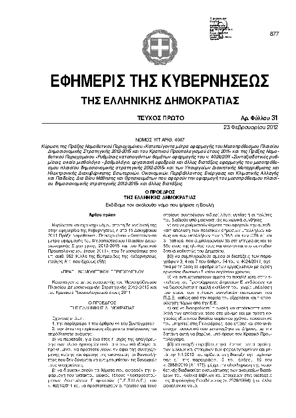 • ΚΥΡΩΣΗ ΤΗΣ ΠΡΑΞΗΣ ΝΟΜΟΘΕΤΙΚΟΥ ΠΕΡΙΕΧΟΜΕΝΟΥ «ΚΑΤΕΠΕΙΓΟΝΤΑ ΜΕΤΡΑ ΕΦΑΡΜΟΓΗΣ ΤΟΥ ΜΕΣΟΠΡΟΘΕΣΜΟΥ ΠΛΑΙΣΙΟΥ ΔΗΜΟΣΙΟΝΟΜΙΚΗΣ ΣΤΡΑΤΗΓΙΚΗΣ 2012-2015 ΚΑΙ ΤΟΥ ΚΡΑΤΙΚΟΥ ΠΡΟΥΠΟΛΟΓΙΣΜΟΥ ΕΤΟΥΣ 2011» ΚΑΙ ΤΗΣ ΠΡΑΞΗΣ ΝΟΜΟΘΕΤΙΚΟΥ ΠΕΡΙΕΧΟΜΕΝΟΥ «ΡΥΘΜΙΣΕΙΣ ΚΑΤΕΠΕΙΓΟΝΤΩΝ ΘΕΜΑΤΩΝ ΕΦΑΡΜΟΓΗΣ ΤΟΥ Ν. 4024/2011 «ΣΥΝΤΑΞΙΟΔΟΤΙΚΕΣ ΡΥΘΜΙΣΕΙΣ, ΕΝΙΑΙΟ ΜΙΣΘΟΛΟΓΙΟ - ΒΑΘΜΟΛΟΓΙΟ, ΕΡΓΑΣΙΑΚΗ ΕΦΕΔΡΕΙΑ ΚΑΙ ΑΛΛΕΣ ΔΙΑΤΑΞΕΙΣ ΕΦΑΡΜΟΓΗΣ ΤΟΥ ΜΕΣΟΠΡΟΘΕΣΜΟΥ ΠΛΑΙΣΙΟΥ ΔΗΜΟΣΙΟΝΟΜΙΚΗΣ ΣΤΡΑΤΗΓΙΚΗΣ 2012-2015» ΚΑΙ ΤΩΝ ΥΠΟΥΡΓΕΙΩΝ ΔΙΟΙΚΗΤΙΚΗΣ ΜΕΤΑΡΡΥΘΜΙΣΗΣ ΚΑΙ ΗΛΕΚΤΡΟΝΙΚΗΣ ΔΙΑΚΥΒΕΡΝΗΣΗΣ, ΕΣΩΤΕΡΙΚΩΝ, ΟΙΚΟΝΟΜΙΚΩΝ, ΠΕΡΙΒΑΛΛΟΝΤΟΣ, ΕΝΕΡΓΕΙΑΣ ΚΑΙ ΚΛΙΜΑΤΙΚΗΣ ΑΛΛΑΓΗΣ ΚΑΙ ΠΑΙΔΕΙΑΣ, ΔΙΑ ΒΙΟΥ ΜΑΘΗΣΗΣ ΚΑΙ ΘΡΗΣΚΕΥΜΑΤΩΝ ΠΟΥ ΑΦΟΡΟΥΝ ΤΗΝ ΕΦΑΡΜΟΓΗ ΤΟΥ ΜΕΣΟΠΡΟΘΕΣΜΟΥ ΠΛΑΙΣΙΟΥ ΔΗΜΟΣΙΟΝΟΜΙΚΗΣ ΣΤΡΑΤΗΓΙΚΗΣ 2012-2015» ΚΑΙ ΑΛΛΕΣ ΔΙΑΤΑΞΕΙΣ.
