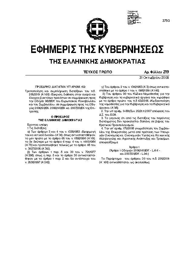 • ΤΡΟΠΟΠΟΙΗΣΗ ΚΑΙ ΣΥΜΠΛΗΡΩΣΗ ΔΙΑΤΑΞΕΩΝ ΤΟΥ Π.Δ 205/2001 (Α΄160) «ΕΓΚΡΙΣΗ, ΔΙΑΘΕΣΗ ΣΤΗΝ ΑΓΟΡΑ ΚΑΙ ΕΛΕΓΧΟΣ ΒΙΟΚΤΟΝΩΝ ΠΡΟΙΟΝΤΩΝ ΣΕ ΣΥΜΜΟΡΦΩΣΗ ΠΡΟΣ ΤΗΝ ΟΔΗΓΙΑ 98/8/ΕΚ ΤΟΥ ΕΥΡΩΠΑΙΚΟΥ ΚΟΙΝΟΒΟΥΛΙΟΥ ΚΑΙ ΤΟΥ ΣΥΜΒΟΥΛΙΟΥ», ΣΕ ΣΥΜΜΟΡΦΩΣΗ ΠΡΟΣ ΤΙΣ ΟΔΗΓΙΕΣ 2006/50/ΕΚ, 2006/140/ΕΚ ΚΑΙ 2007/20/ΕΚ ΤΗΣ ΕΠΙΤΡΟΠΗΣ.