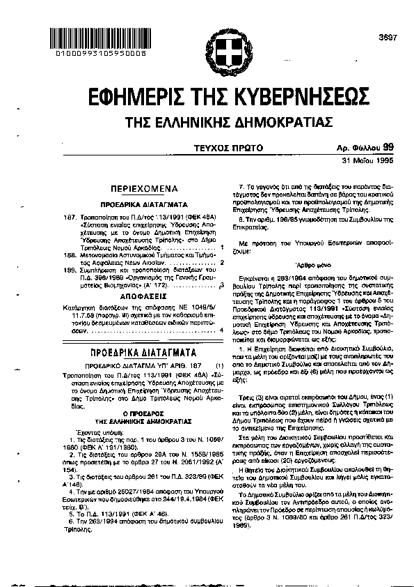 • ΤΡΟΠΟΠΟΙΗΣΗ ΤΟΥ Π.Δ/ΤΟΣ 113/1991 (ΦΕΚ 46Α) ΣΥΣΤΑΣΗ ΕΝΙΑΙΑΣ ΕΠΙΧΕΙΡΗΣΗΣ ΥΔΡΕΥΣΗΣ ΑΠΟΧΕΤΕΥΣΗΣ ΜΕ ΤΟ ΟΝΟΜΑ ΔΗΜΟΤΙΚΗΣ ΕΠΙΧΕΙΡΗΣΗ ΥΔΡΕΥΣΗΣ ΑΠΟΧΕΤΕΥΣΗΣ ΤΡΙΠΟΛΗΣ ΣΤΟ ΔΗΜΟ ΤΡΙΠΟΛΕΩΣ ΝΟΜΟΥ ΑΡΚΑΔΙΑΣ