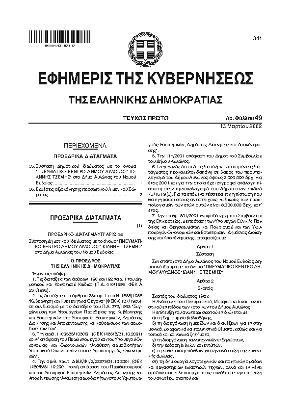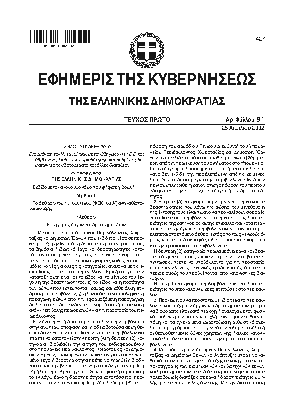 ΕΝΑΡΜΟΝΙΣΗ ΤΟΥ Ν. 1650/1986 ΜΕ ΤΙΣ ΟΔΗΓΙΕΣ 97/11 Ε.Ε. ΚΑΙ 96/61 Ε.Ε., ΔΙΑΔΙΚΑΣΙΑ ΟΡΙΟΘΕΤΗΣΗΣ ΚΑΙ ΡΥΘΜΙΣΕΙΣ ΘΕΜΑΤΩΝ ΓΙΑ ΤΑ ΥΔΑΤΟΡΕΜΑΤΑ ΚΑΙ ΑΛΛΕΣ ΔΙΑΤΑΞΕΙΣ