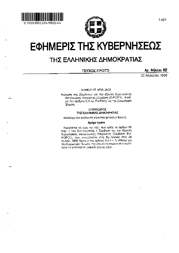 • ΚΥΡΩΣΗ ΤΗΣ ΣΥΜΒΑΣΗΣ ΓΙΑ ΤΗΝ ΙΔΡΥΣΗ ΕΥΡΩΠΑΪΚΗΣ ΑΣΤΥΝΟΜΙΚΗΣ ΥΠΗΡΕΣΙΑΣ ΣΥΜΒΑΣΗ EUROPOL ΔΥΝΑΜΕΙ ΤΟΥ ΑΡΘΡΟΥ Κ.3 ΤΗΣ ΣΥΝΘΗΚΗΣ ΓΙΑ ΤΗΝ ΕΥΡΩΠΑΪΚΗ ΕΝΩΣΗ