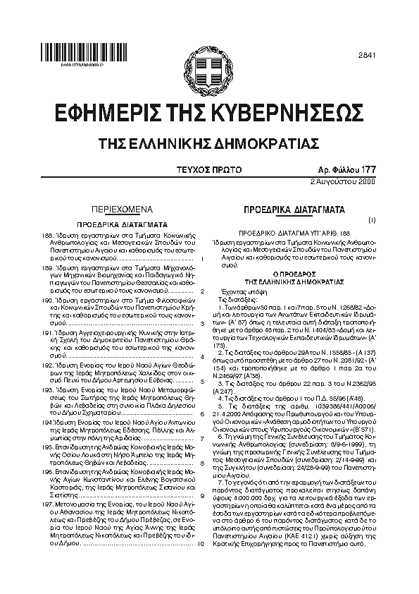 ΙΔΡΥΣΗ ΕΡΓΑΣΤΗΡΙΩΝ ΣΤΑ ΤΜΗΜΑΤΑ ΚΟΙΝΩΝΙΚΗΣ ΑΝΘΡΩΠΟΛΟΓΙΑΣ ΚΑΙ ΜΕΣΟΓΕΙΑΚΩΝ ΣΠΟΥΔΩΝ ΤΟΥ ΠΑΝΕΠΙΣΤΗΜΙΟΥ ΑΙΓΑΙΟΥ ΚΑΙ ΚΑΘΟΡΙΣΜΟΣ ΤΟΥ ΕΣΩΤΕΡΙΚΟΥ ΤΟΥΣ ΚΑΝΟΝΙΣΜΟΥ