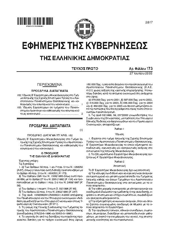 ΙΔΡΥΣΗ Β΄ ΕΡΓΑΣΤΗΡΙΟΥ ΜΙΚΡΟΒΙΟΛΟΓΙΑΣ ΣΤΟ ΤΜΗΜΑ ΙΑΤΡΙΚΗΣ ΤΗΣ ΣΧΟΛΗΣ ΕΠΙΣΤΗΜΩΝ ΥΓΕΙΑΣ ΤΟΥ ΑΡΙΣΤΟΤΕΛΕΙΟΥ ΠΑΝΕΠΙΣΤΗΜΙΟΥ ΘΕΣΣΑΛΟΝΙΚΗΣ ΚΑΙ ΚΑΘΟΡΙΣΜΟΣ ΤΟΥ ΕΣΩΤΕΡΙΚΟΥ ΤΟΥ ΚΑΝΟΝΙΣΜΟΥ