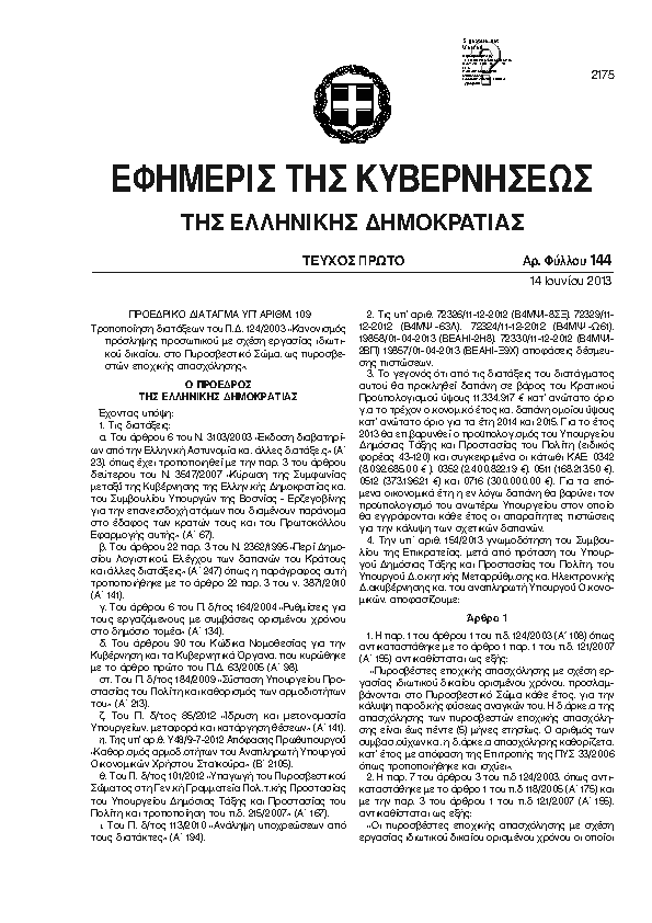«ΤΡΟΠΟΠΟΙΗΣΗ ΔΙΑΤΑΞΕΩΝ ΤΟΥ Π.Δ. 124/2003 «ΚΑΝΟΝΙΣΜΟΣ ΠΡΟΣΛΗΨΗΣ ΠΡΟΣΩΠΙΚΟΥ ΜΕ ΣΧΕΣΗ ΕΡΓΑΣΙΑΣ ΙΔΙΩΤΙΚΟΥ ΔΙΚΑΙΟΥ, ΣΤΟ ΠΥΡΟΣΒΕΣΤΙΚΟ ΣΩΜΑ, ΩΣ ΠΥΡΟΣΒΕΣΤΩΝ ΕΠΟΧΙΚΗΣ ΑΠΑΣΧΟΛΗΣΗΣ».