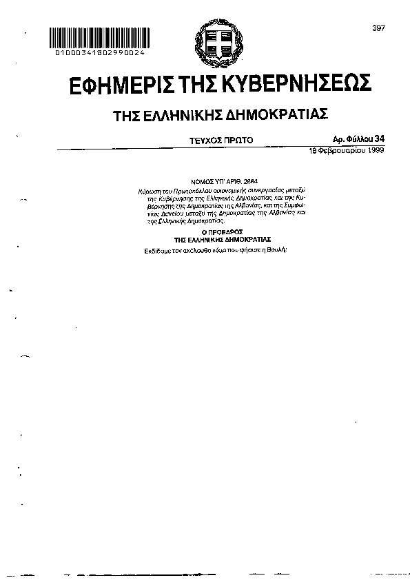 • ΚΥΡΩΣΗ ΤΟΥ ΠΡΩΤΟΚΟΛΛΟΥ ΟΙΚΟΝΟΜΙΚΗΣ ΣΥΝΕΡΓΑΣΙΑΣ ΜΕΤΑΞΥ ΤΗΣ ΚΥΒΕΡΝΗΣΗΣ ΤΗΣ ΕΛΛΗΝΙΚΗΣ ΔΗΜΟΚΡΑΤΙΑΣ ΚΑΙ ΤΗΣ ΚΥΒΕΡΝΗΣΗΣ ΤΗΣ ΔΗΜΟΚΡΑΤΙΑΣ ΤΗΣ ΑΛΒΑΝΙΑΣ ΚΑΙ ΤΗΣ ΣΥΜΦΩΝΙΑΣ ΔΑΝΕΙΟΥ ΜΕΤΑΞΥ ΤΗΣ ΔΗΜΟΚΡΑΤΙΑΣ ΤΗΣ ΑΛΒΑΝΙΑΣ ΚΑΙ ΤΗΣ ΕΛΛΗΝΙΚΗΣ ΔΗΜΟΚΡΑΤΙΑΣ