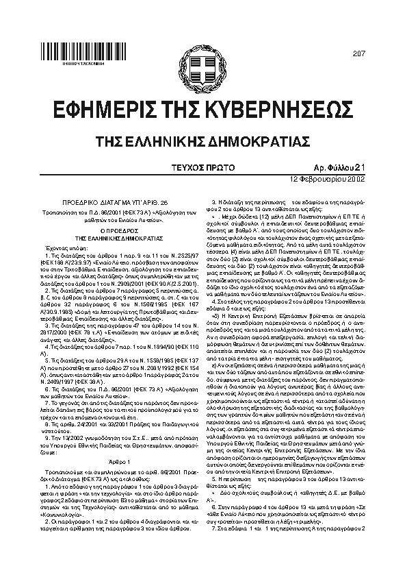 • ΤΡΟΠΟΠΟΙΗΣΗ ΤΟΥ Π.Δ. 86/2001 (ΦΕΚ 73 Α ) «ΑΞΙΟΛΟΓΗΣΗ ΤΩΝ ΜΑΘΗΤΩΝ ΤΟΥ ΕΝΙΑΙΟΥ ΛΥΚΕΙΟΥ»