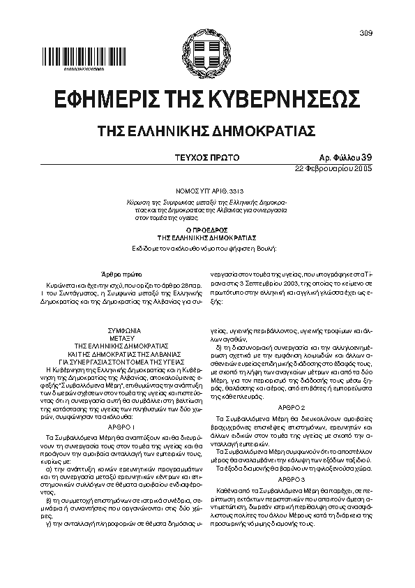 • ΚΥΡΩΣΗ ΤΗΣ ΣΥΜΦΩΝΙΑΣ ΜΕΤΑΞΥ ΤΗΣ ΕΛΛΗΝΙΚΗΣ ΔΗΜΟΚΡΑΤΙΑΣ ΚΑΙ ΤΗΣ ΔΗΜΟΚΡΑΤΙΑΣ ΤΗΣ ΑΛΒΑΝΙΑΣ ΓΙΑ ΣΥΝΕΡΓΑΣΙΑ ΣΤΟΝ ΤΟΜΕΑ ΤΗΣ ΥΓΕΙΑΣ