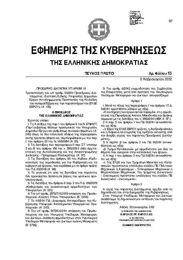 ΤΡΟΠΟΠΟΙΗΣΗ ΤΟΥ ΥΠ’ ΑΡΙΘΜ. 54/2011 ΠΡΟΕΔΡΙΚΟΥ ΔΙΑΤΑΓΜΑΤΟΣ «ΣΥΣΤΑΣΗ ΕΙΔΙΚΗΣ ΥΠΗΡΕΣΙΑΣ ΔΗΜΟΣΙΩΝ ΕΡΓΩΝ ΑΝΤΙΠΛΗΜΜΥΡΙΚΗΣ ΠΡΟΣΤΑΣΙΑΣ ΤΗΣ ΚΟΙΛΑΔΑΣ ΤΟΥ ΠΟΤΑΜΟΥ ΕΒΡΟΥ ΚΑΙ ΤΩΝ ΠΑΡΑΠΟΤΑΜΩΝ ΤΟΥ (ΕΥΔΕ ΕΒΡΟΥ)» (Α΄ 135).