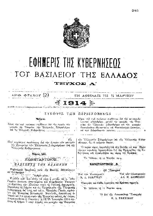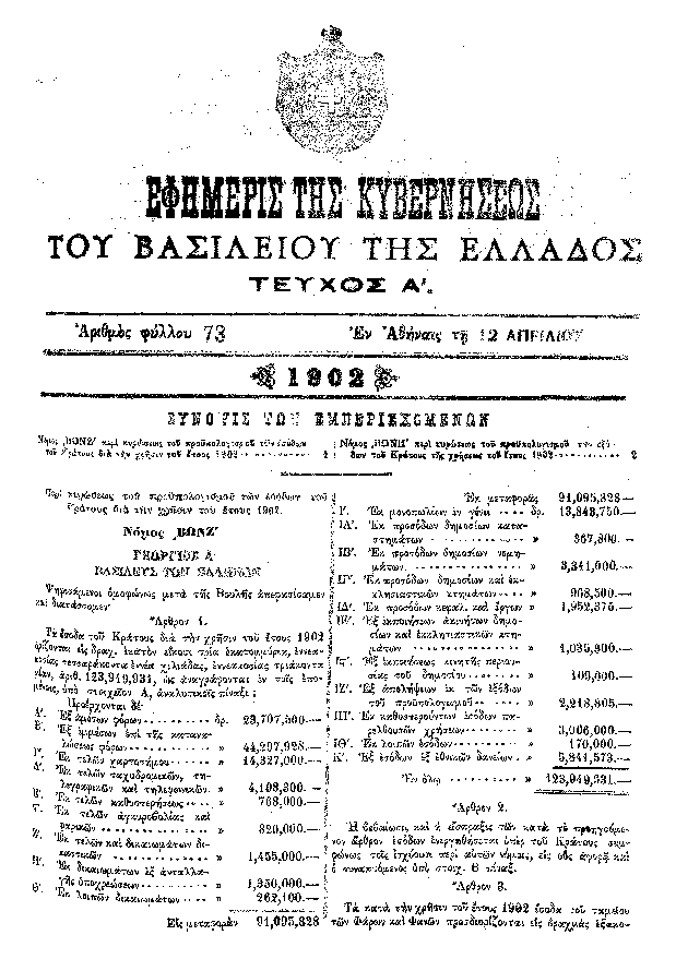 ΠΕΡΙ ΚΥΡΩΣΕΩΣ ΤΟΥ ΠΡΟΫΠΟΛΟΓΙΣΜΟΥ ΤΩΝ ΕΣΟΔΩΝ ΤΟΥ ΚΡΑΤΟΥΣ ΤΗΣ ΧΡΗΣΕΩΣ ΤΟΥ ΕΤΟΥΣ 1910 ΚΑΙ ΤΩΝ ΠΡΟΫΠΟΛΟΓΙΣΜΩΝ ΤΩΝ ΕΣΟΔΩΝ ΤΩΝ ΕΙΣ ΤΗΝ ΑΡΜΟΔΙΟΤΗΤΑ ΤΟΥ ΥΠΟΥΡΓΕΙΟΥ ΤΩΝ ΕΚΚΛΗΣΙΑΣΤΙΚΩΝ ΚΑΙ ΤΗΣ ΔΗΜΟΣΙΑΣ ΕΚΠΑΙΔΕΥΣΕΩΣ ΥΠΑΓΟΜΕΝΩΝ ΚΛΗΡΟΔΟΤΗΜΑΤΩΝ, ΤΟΥ ΤΑΜΕΙΟΥ ΤΗΣ ΕΘΝΙΚΗΣ ΑΜΥΝΗ, ΤΟΥ ΤΑΜΕΙΟΥ ΤΟΥ ΕΘΝΙΚΟΥ ΣΤΟΛΟΥ, ΤΟΥ ΛΑΧΕΙΟΥ ΥΠΕΡ ΤΟΥ ΕΘΝΙΚΟΥ ΣΤΟΛΟΥ ΚΑΙ ΤΩΝ ΑΡΧΑΙΟΤΗΤΩΝ ΤΗΣ ΕΛΛΑΔΟΣ, ΤΟΥ ΤΑΜΕΙΟΥ ΤΩΝ ΦΟΡΩΝ ΚΑΙ ΦΑΝΩΝ, ΤΟΥ ΘΕΣΣΑΛΙΚΟΥ ΓΕΩΡΓΙΚΟΥ ΤΑΜΕΙΟΥ ΚΑΙ ΤΟΥ ΑΡΧΑΙΟΛΟΓΙΚΟΥ ΤΑΜΕΙΟΥ ΤΗΣ ΙΔΙΑΣ ΧΡΗΣΕΩΣ