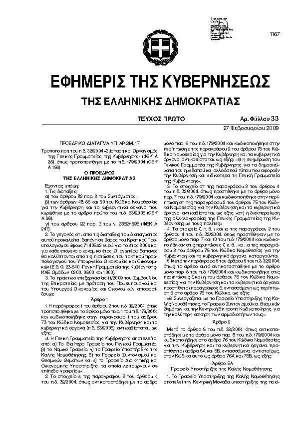 ΤΡΟΠΟΠΟΙΗΣΗ ΤΟΥ Π.Δ. 32/2004 "ΣΥΣΤΑΣΗ ΚΑΙ ΟΡΓΑΝΙΣΜΟΣ ΤΗΣ ΓΕΝΙΚΗΣ ΓΡΑΜΜΑΤΕΙΑΣ ΤΗΣ ΚΥΒΕΡΝΗΣΗΣ" (ΦΕΚ Α 28), ΟΠΩΣ ΤΡΟΠΟΠΟΙΗΘΗΚΕ ΜΕ ΤΟ Π.Δ. 179/2004 (ΦΕΚ Α 156).