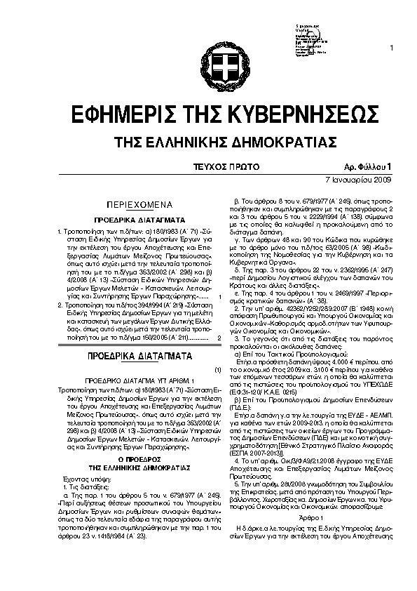 ΤΡΟΠΟΠΟΙΗΣΗ ΤΩΝ Π.Δ/ΤΩΝ: Α) 180/1983 (Α’ 71) «ΣΥΣΤΑΣΗ ΕΙΔΙΚΗΣ ΥΠΗΡΕΣΙΑΣ ΔΗΜΟΣΙΩΝ ΕΡΓΩΝ ΓΙΑ ΤΗΝ ΕΚΤΕΛΕΣΗ ΤΟΥ ΕΡΓΟΥ ΑΠΟΧΕΤΕΥΣΗΣ ΚΑΙ ΕΠΕΞΕΡΓΑΣΙΑΣ ΛΥΜΑΤΩΝ ΜΕΙΖΟΝΟΣ ΠΡΩΤΕΥΟΥΣΑΣ», ΟΠΩΣ ΑΥΤΟ ΙΣΧΥΕΙ ΜΕΤΑ ΤΗΝ ΤΕΛΕΥΤΑΙΑ ΤΡΟΠΟΠΟΙΗΣΗ ΤΟΥ ΜΕ ΤΟ Π.Δ/ΓΜΑ 353/2002 (Α’ 298) ΚΑΙ Β) 4/2008 (Α’ 13) «ΣΥΣΤΑΣΗ ΕΙΔΙΚΩΝ ΥΠΗΡΕΣΙΩΝ ΔΗΜΟΣΙΩΝ ΕΡΓΩΝ ΜΕΛΕΤΩΝ – ΚΑΤΑΣΚΕΥΩΝ, ΛΕΙΤΟΥΡΓΙΑΣ ΚΑΙ ΣΥΝΤΗΡΗΣΗΣ ΕΡΓΩΝ ΠΑΡΑΧΩΡΗΣΗΣ».