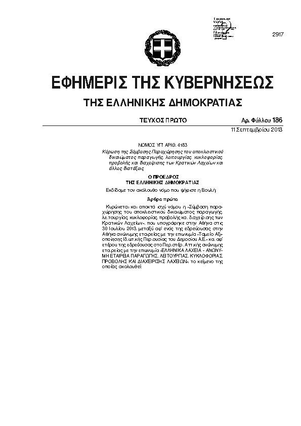 ΚΥΡΩΣΗ ΤΗΣ ΣΥΜΒΑΣΗΣ ΠΑΡΑΧΩΡΗΣΗΣ ΤΟΥ ΑΠΟΚΛΕΙΣΤΙΚΟΥ ΔΙΚΑΙΩΜΑΤΟΣ ΠΑΡΑΓΩΓΗΣ, ΛΕΙΤΟΥΡΓΙΑΣ, ΚΥΚΛΟΦΟΡΙΑΣ, ΠΡΟΒΟΛΗΣ ΚΑΙ ΔΙΑΧΕΙΡΙΣΗΣ ΤΩΝ ΚΡΑΤΙΚΩΝ ΛΑΧΕΙΩΝ ΚΑΙ ΑΛΛΕΣ ΔΙΑΤΑΞΕΙΣ