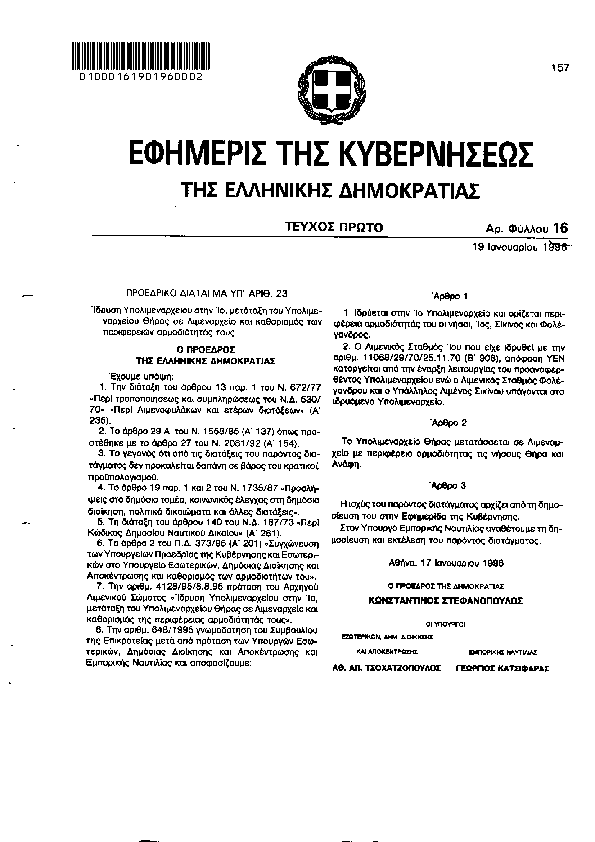 • ΙΔΡΥΣΗ ΥΠΟΛΙΜΕΝΑΡΧΕΙΟΥ ΣΤΗΝ ΙΟ ΜΕΤΑΤΑΞΗ ΤΟΥ ΥΠΟΛΙΜΕΝΑΡΧΕΙΟΥ ΘΗΡΑΣ ΣΕ ΛΙΜΕΝΑΡΧΕΙΟ ΚΑΙ ΚΑΘΟΡΙΣΜΟΣ ΤΩΝ ΠΕΡΙΦΕΡΕΙΩΝ ΑΡΜΟΔΙΟΤΗΤΑΣ