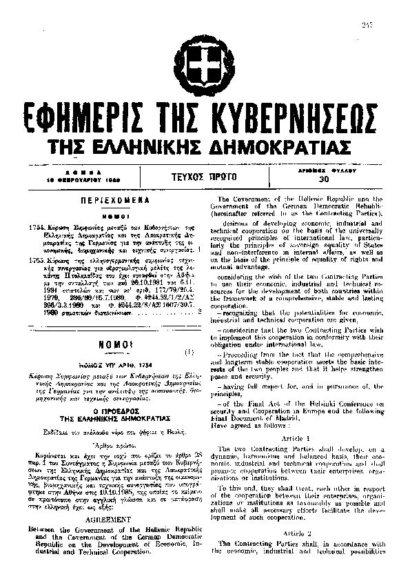 ΚΥΡΩΣΗ ΣΥΜΦΩΝΙΑΣ ΜΕΤΑΞΥ ΤΩΝ ΚΥΒΕΡΝΗΣΕΩΝ ΤΗΣ ΕΛΛΗΝΙΚΗΣ ΔΗΜΟΚΡΑΤΙΑΣ ΚΑΙ ΤΗΣ ΛΑΟΚΡΑΤΙΚΗΣ ΔΗΜΟΚΡΑΤΙΑΣ ΤΗΣ ΓΕΡΜΑΝΙΑΣ ΓΙΑ ΤΗΝ ΑΝΑΠΤΥΞΗ, ΤΗΣ OΙΚΟΝΟΜΙΑΣ, ΒΙΟΜΗΧΑΝΙΚΗΣ ΚΑΙ ΤΕΧΝΙΚΗΣ ΣΥΝΕΡΓΑΣΙΑΣ.