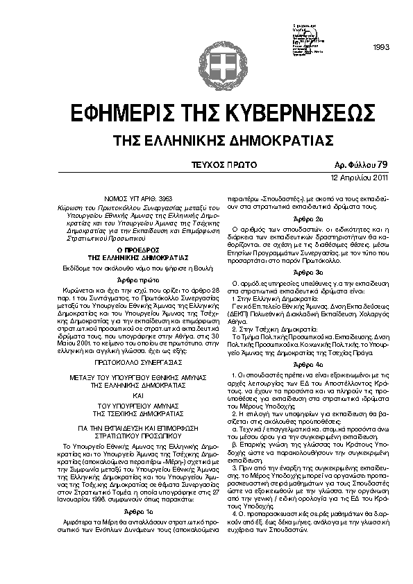 ΚΥΡΩΣΗ ΤΟΥ ΠΡΩΤΟΚΟΛΛΟΥ ΣΥΝΕΡΓΑΣΙΑΣ ΜΕΤΑΞΥ ΤΟΥ ΥΠΟΥΡΓΕΙΟΥ ΕΘΝΙΚΗΣ ΑΜΥΝΑΣ ΤΗΣ ΕΛΛΗΝΙΚΗΣ ΔΗΜΟΚΡΑΤΙΑΣ ΚΑΙ ΤΟΥ ΥΠΟΥΡΓΕΙΟΥ ΑΜΥΝΑΣ ΤΗΣ ΤΣΕΧΙΚΗΣ ΔΗΜΟΚΡΑΤΙΑΣ ΓΙΑ ΤΗΝ ΕΚΠΑΙΔΕΥΣΗ ΚΑΙ ΕΠΙΜΟΡΦΩΣΗ ΣΤΡΑΤΙΩΤΙΚΟΥ ΠΡΟΣΩΠΙΚΟΥ.