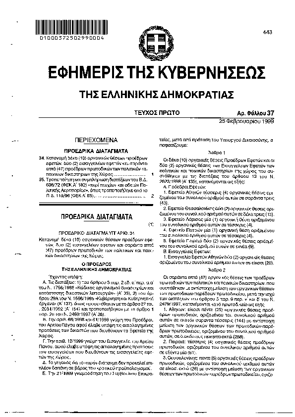 • ΚΑΤΑΝΟΜΗ ΔΕΚΑ 10 ΟΡΓΑΝΙΚΩΝ ΘΕΣΕΩΝ ΠΡΟΕΔΡΩΝ ΕΦΕΤΩΝ ΔΥΟ ΕΙΣΑΓΓΕΛΕΩΝ ΕΦΕΤΩΝ ΚΑΙ 47 ΠΡΟΕΔΡΩΝ ΠΡΩΤΟΔΙΚΩΝ ΤΩΝ ΠΟΛΙΤΙΚΩΝ ΚΑΙ ΠΟΙΝΙΚΩΝ ΔΙΚΑΣΤΗΡΙΩΝ ΤΗΣ ΧΩΡΑΣ