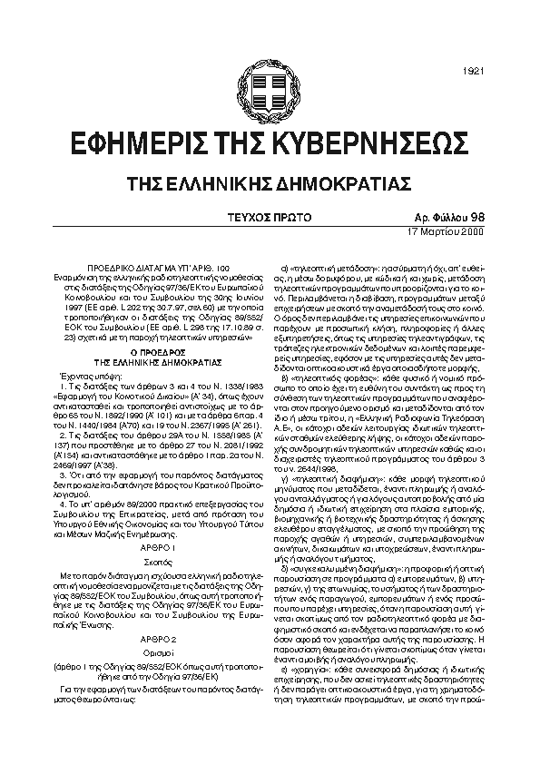 ΕΝΑΡΜΟΝΙΣΗ ΤΗΣ ΕΛΛΗΝΙΚΗΣ ΡΑΔΙΟΤΗΛΕΟΠΤΙΚΗΣ ΝΟΜΟΘΕΣΙΑΣ ΣΤΙΣ ΔΙΑΤΑΞΕΙΣ ΤΗΣ ΟΔΗΓΙΑΣ 97/36 ΕΚ ΤΟΥ ΕΥΡΩΠΑΪΚΟΥ ΚΟΙΝΟΒΟΥΛΙΟΥ ΤΗΣ 30ΗΣ ΙΟΥΝΙΟΥ 1997 ...ΣΧΕΤΙΚΑ ΜΕ ΤΗ ΠΑΡΟΧΗ ΤΗΛΕΟΠΤΙΚΩΝ ΥΠΗΡΕΣΙΩΝ