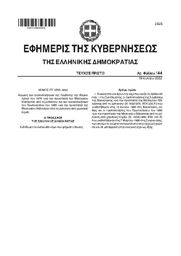 ΚΥΡΩΣΗ ΤΩΝ ΤΡΟΠΟΠΟΙΗΣΕΩΝ ΤΗΣ ΣΥΜΒΑΣΗΣ ΤΗΣ ΒΑΡΚΕΛΩΝΗΣ ΤΟΥ 1976 «ΓΙΑ ΤΗΝ ΠΡΟΣΤΑΣΙΑ ΤΗΣ ΜΕΣΟΓΕΙΟΥ ΘΑΛΑΣΣΑΣ ΑΠΟ ΤΗ ΡΥΠΑΝΣΗ» ΚΑΙ ΤΩΝ ΤΡΟΠΟΠΟΙΗΣΕΩΝ ΤΟΥ ΠΡΩΤΟΚΟΛΛΟΥ ΤΟΥ 1980 «ΓΙΑ ΤΗΝ ΠΡΟΣΤΑΣΙΑ ΤΗΣ ΜΕΣΟΓΕΙΟΥ ΘΑΛΑΣΣΑΣ ΑΠΟ ΤΗ ΡΥΠΑΝΣΗ ΑΠΟ ΧΕΡΣΑΙΕΣ ΠΗΓΕΣ