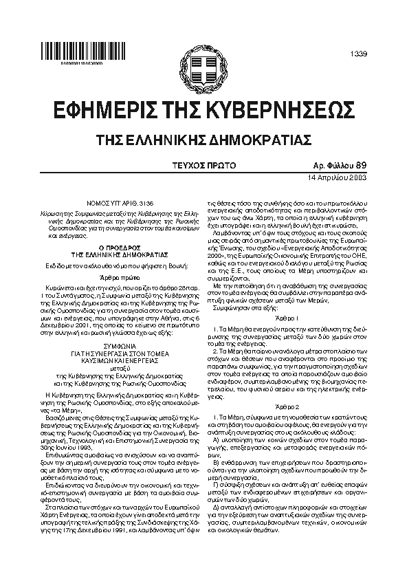 • ΚΥΡΩΣΗ ΤΗΣ ΣΥΜΦΩΝΙΑΣ ΜΕΤΑΞΥ ΤΗΣ ΚΥΒΕΡΝΗΣΗΣ ΤΗΣ ΕΛΛΗΝΙΚΗΣ ΔΗΜΟΚΡΑΤΙΑΣ ΚΑΙ ΤΗΣ ΚΥΒΕΡΝΗΣΗΣ ΤΗΣ ΡΩΣΙΚΗΣ ΟΜΟΣΠΟΝΔΙΑΣ ΓΙΑ ΤΗ ΣΥΝΕΡΓΑΣΙΑ ΣΤΟΝ ΤΟΜΕΑ ΚΑΥΣΙΜΩΝ ΚΑΙ ΕΝΕΡΓΕΙΑΣ