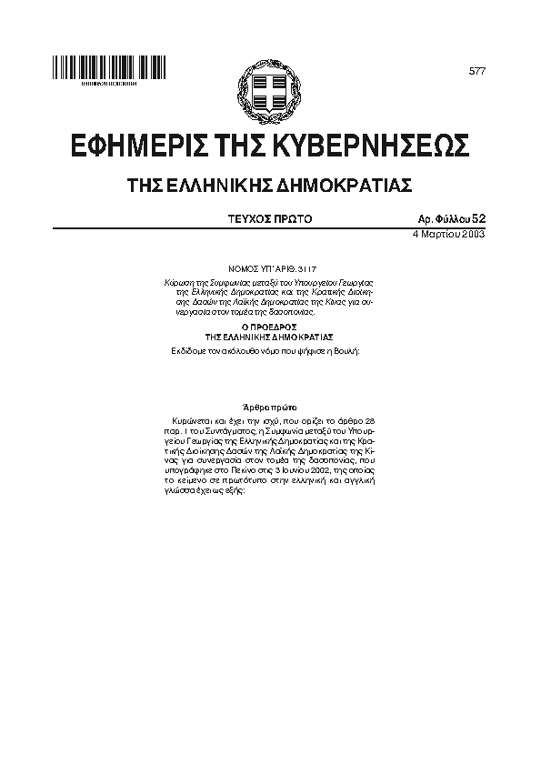 • ΚΥΡΩΣΗ ΤΗΣ ΣΥΜΦΩΝΙΑΣ ΜΕΤΑΞΥ ΤΟΥ ΥΠΟΥΡΓΕΙΟΥ ΓΕΩΡΓΙΑΣ ΤΗΣ ΕΛΛΗΝΙΚΗΣ ΔΗΜΟΚΡΑΤΙΑΣ ΚΑΙ ΤΗΣ ΚΡΑΤΙΚΗΣ ΔΙΟΙΚΗΣΗΣ ΔΑΣΩΝ ΤΗΣ ΛΑΪΚΗΣ ΔΗΜΟΚΡΑΤΙΑΣ ΤΗΣ ΚΙΝΑΣ ΓΙΑ ΣΥΝΕΡΓΑΣΙΑ ΣΤΟΝ ΤΟΜΕΑ ΤΗΣ ΔΑΣΟΠΟΝΙΑΣ