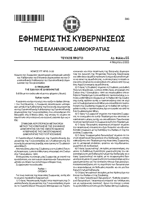• ΚΥΡΩΣΗ ΤΗΣ ΣΥΜΦΩΝΙΑΣ ΑΕΡΟΠΟΡΙΚΩΝ ΜΕΤΑΦΟΡΩΝ ΜΕΤΑΞΥ ΤΗΣ ΚΥΒΕΡΝΗΣΗΣ ΤΗΣ ΕΛΛΗΝΙΚΗΣ ΔΗΜΟΚΡΑΤΙΑΣ ΚΑΙ ΤΗΣ ΟΜΟΣΠΟΝΔΙΑΚΗΣ ΚΥΒΕΡΝΗΣΗΣ ΤΗΣ ΟΜΟΣΠΟΝΔΙΑΚΗΣ ΔΗΜΟΚΡΑΤΙΑΣ ΤΗΣ ΓΙΟΥΓΚΟΣΛΑΒΙΑΣ