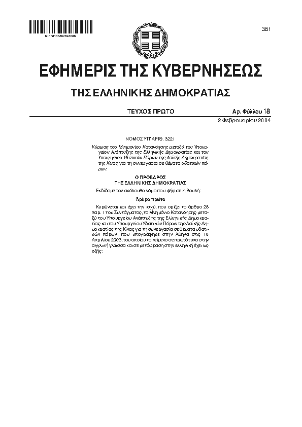 ΚΥΡΩΣΗ ΤΟΥ ΜΝΗΜΟΝΙΟΥ ΚΑΤΑΝΟΗΣΗΣ ΜΕΤΑΞΥ ΤΟΥ ΥΠΟΥΡΓΕΙΟΥ ΑΝΑΠΤΥΞΗΣ ΤΗΣ ΕΛΛΗΝΙΚΗΣ ΔΗΜΟΚΡΑΤΙΑΣ ΚΑΙ ΤΟΥ ΥΠΟΥΡΓΕΙΟΥ ΥΔΑΤΙΚΩΝ ΠΟΡΩΝ ΤΗΣ ΛΑΪΚΗΣ ΔΗΜΟΚΡΑΤΙΑΣ ΤΗΣ ΚΙΝΑΣ ΓΙΑ ΤΗ ΣΥΝΕΡΓΑΣΙΑ ΣΕ ΘΕΜΑΤΑ ΥΔΑΤΙΚΩΝ ΠΟΡΩΝ
