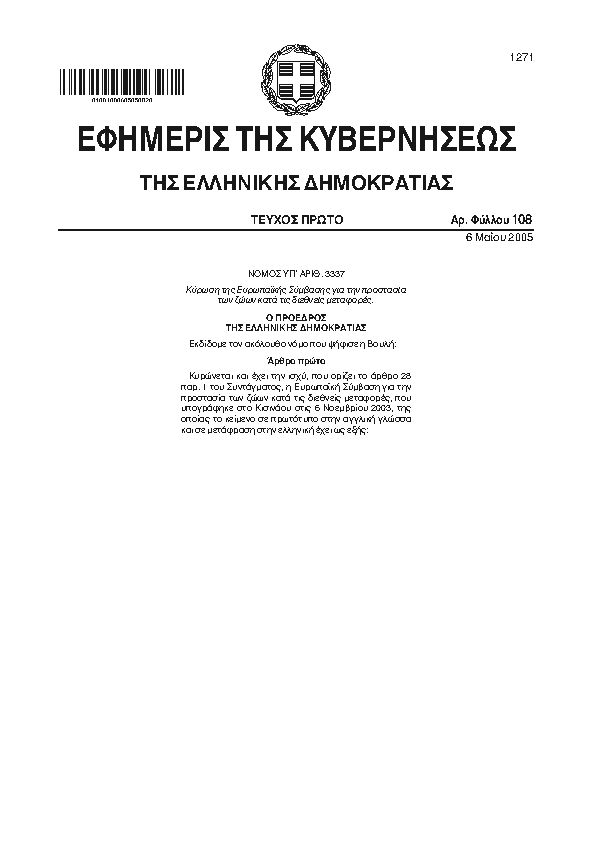 • ΚΥΡΩΣΗ ΤΗΣ ΕΥΡΩΠΑΪΚΗΣ ΣΥΜΒΑΣΗΣ ΓΙΑ ΤΗΝ ΠΡΟΣΤΑΣΙΑ ΤΩΝ ΖΩΩΝ ΚΑΤΑ ΤΙΣ ΔΙΕΘΝΕΙΣ ΜΕΤΑΦΟΡΕΣ