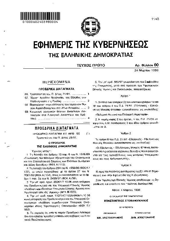 7. ΦΕΚ 60/A, 1998 http://www.et.gr/ Προεδρικό Διάταγμα