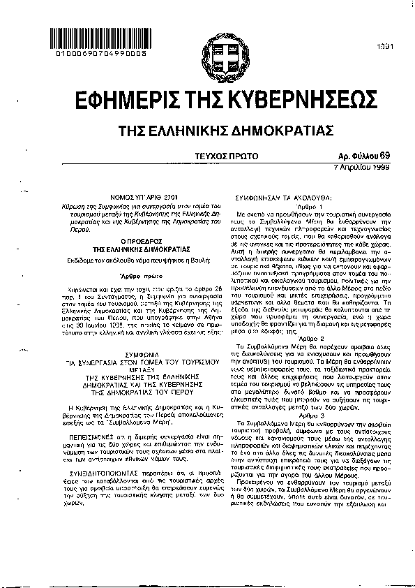 ΚΥΡΩΣΗ ΤΗΣ ΣΥΜΦΩΝΙΑΣ ΓΙΑ ΣΥΝΕΡΓΑΣΙΑ ΣΤΟΝ ΤΟΜΕΑ ΤΟΥ ΤΟΥΡΙΣΜΟΥ ΜΕΤΑΞΥ ΤΗΣ ΚΥΒΕΡΝΗΣΗΣ ΤΗΣ ΕΛΛΗΝΙΚΗΣ ΔΗΜΟΚΡΑΤΙΑΣ ΚΑΙ ΤΗΣ ΚΥΒΕΡΝΗΣΗΣ ΤΗΣ ΔΗΜΟΚΡΑΤΙΑΣ ΤΟΥ ΠΕΡΟΥ