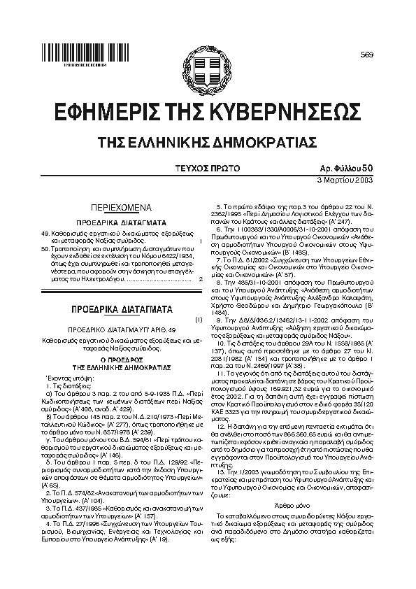 9. ΦΕΚ 78/A, 2003 http://www.et.gr/ Προεδρικό Διάταγμα