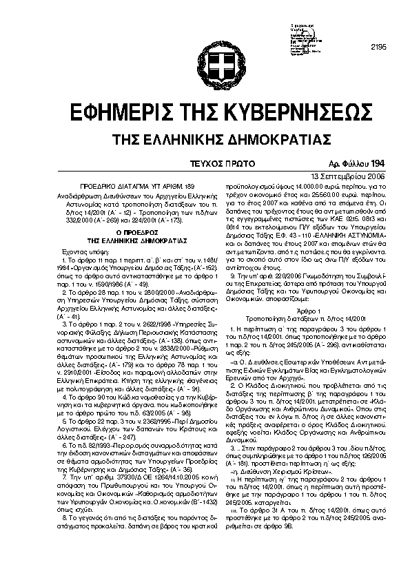 • ΑΝΑΔΙΑΡΘΡΩΣΗ ΔΙΕΥΘΥΝΣΕΩΝ ΤΟΥ ΑΡΧΗΓΕΙΟΥ ΕΛΛΗΝΙΚΗΣ ΑΣΤΥΝΟΜΙΑΣ ΚΑΤΑ ΤΡΟΠΟΠΟΙΗΣΗ ΔΙΑΤΑΞΕΩΝ ΤΟΥ Π. Δ/ΤΟΣ 14/2001 (Α- 12) - ΤΡΟΠΟΠΟΙΗΣΗ ΤΩΝ Π.Δ/ΤΩΝ 332/2000 (Α - 269) ΚΑΙ 224/2001 (Α - 173).
