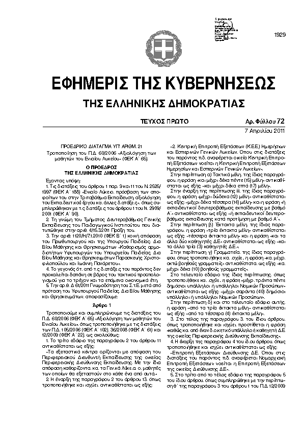 • ΤΡΟΠΟΠΟΙΗΣΗ ΤΟΥ Π.Δ. 60/2006 «ΑΞΙΟΛΟΓΗΣΗ ΤΩΝ ΜΑΘΗΤΩΝ ΤΟΥ ΕΝΙΑΙΟΥ ΛΥΚΕΙΟΥ» (ΦΕΚ Α΄ 65).