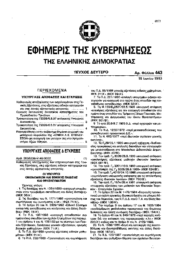 • 'ΤΡΟΠΟΠΟΙΗΣΗ ΚΑΙ ΣΥΜΠΛΗΡΩΣΗ ΤΟΥ Π.Δ. 85/1986 "ΓΕΝΙΚΕΣ ΕΞΕΤΑΣΕΙΣ ΕΙΔΙΚΩΝ ΜΑΘΗΜΑΤΩΝ" ΦΕΚ Α'' 31/1986'