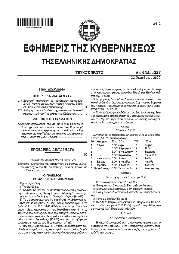• ΣΥΣΤΑΣΗ, ΕΝΟΠΟΙΗΣΗ ΚΑΙ ΚΑΤΑΡΓΗΣΗ ΟΡΙΣΜΕΝΩΝ ΔΟΥ ΤΩΝ ΠΕΡΙΟΧΩΝ ΤΩΝ ΝΟΜΩΝ ΑΤΤΙΚΗΣ ΕΥΒΟΙΑΣ ΚΟΡΙΝΘΙΑΣ ΚΑΙ ΘΕΣΣΑΛΟΝΙΚΗΣ