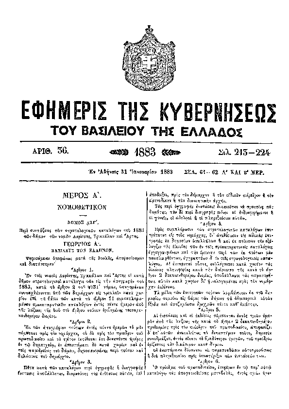 • ΠΕΡΙ ΣΥΝΤΑΞΕΩΣ ΤΩΝ ΣΤΡΑΤΟΛΟΓΙΚΩΝ ΚΑΤΑΛΟΓΩΝ ΤΟΥ 1883 ΤΩΝ ΔΗΜΩΝ ΤΩΝ ΝΟΜΩΝ ΛΑΡΙΣΣΗΣ, ΤΡΙΚΚΑΛΩΝ ΚΑΙ ΑΡΤΗΣ.