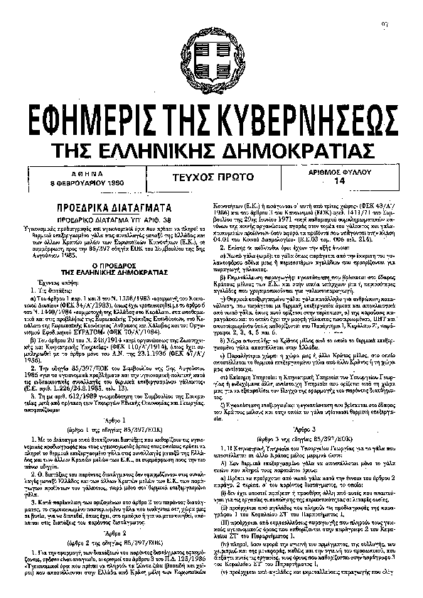 ΥΓΕΙΟΝΟΜΙΚΕΣ ΠΡΟΔΙΑΓΡΑΦΕΣ ΚΑΙ ΥΓΕΙΟΝΟΜΙΚΟΙ ΟΡΟΙ ΠΟΥ ΠΡΕΠΕΙ ΝΑ ΠΛΗΡΟΙ ΤΟ ΘΕΡΜΙΚΑ ΕΠΕΞΕΡΓΑΣΜΕΝΟ ΓΑΛΑ ΣΤΙΣ ΣΥΝΑΛΛΑΓΕΣ ΜΕΤΑΞΥ ΤΗΣ ΕΛΛΑΔΟΣ ΚΑΙ ΤΩΝ ΑΛΛΩΝ ΚΡΑΤΩΝ ΜΕΛΩΝ ΤΩΝ ΕΥΡΩΠΑΪΚΩΝ ΚΟΙΝΟΤΗΤΩΝ (Ε.Κ.), ΣΕ ΣΥΜΜΟΡΦΩΣΗ ΠΡΟΣ ΤΗΝ 85/397 ΟΔΗΓΙΑ ΕΟΚ ΤΟΥ ΣΥΜΒΟΥΛΙΟΥ ΤΗΣ 5ΗΣ ΑΥΓΟΥΣΤΟΥ 1985.