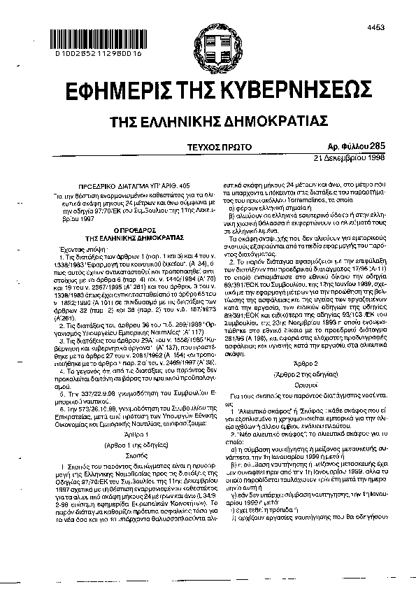 ΤΗΝ ΘΕΣΠΙΣΗ ΕΝΑΡΜΟΝΙΣΜΕΝΟΥ ΚΑΘΕΣΤΩΤΟΣ ΓΙΑ ΤΑ ΑΛΙΕΥΤΙΚΑ ΣΚΑΦΗ ΜΗΚΟΥΣ 24 ΜΕΤΡΩΝ ΚΑΙ ΑΝΩ ΣΥΜΦΩΝΑ ΜΕ ΤΗΝ ΟΔΗΓΙΑ 97/70/ΕΚ ΤΟΥ ΣΥΜΒΟΥΛΙΟΥ ΤΗΣ 11ΗΣ ΔΕΚΕΜΒΡΙΟΥ 1997