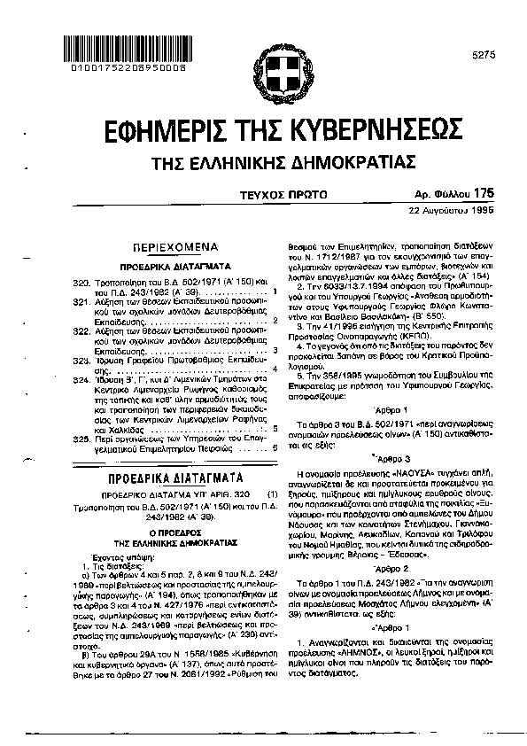 • ΤΡΟΠΟΠΟΙΗΣΗ ΤΟΥ Β.Δ. 502/71 ΚΑΙ ΤΟΥ Π.Δ. 243/82 ΓΙΑ ΤΗΝ ΟΝΟΜΑΣΙΑ ΟΙΝΩΝ