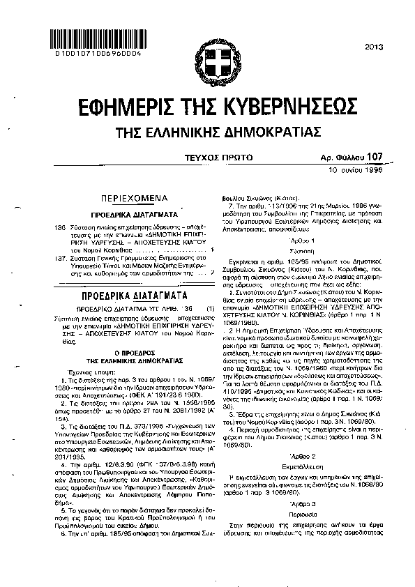 • ΣΥΣΤΑΣΗ ΕΝΙΑΙΑΣ ΕΠΙΧΕΙΡΗΣΗΣ ΥΔΡΕΥΣΗΣ - ΑΠΟΧΕΤΕΥΣΗΣ ΜΕ ΤΗΝ ΕΠΩΝΥΜΙΑ ΔΗΜΟΤΙΚΗΣ ΕΠΙΧΕΙΡΗΣΗ ΥΔΡΕΥΣΗΣ - ΑΠΟΧΕΤΕΥΣΗΣ ΚΙΑΤΟΥ ΤΟΥ Ν.ΚΟΡΙΝΘΙΑΣ